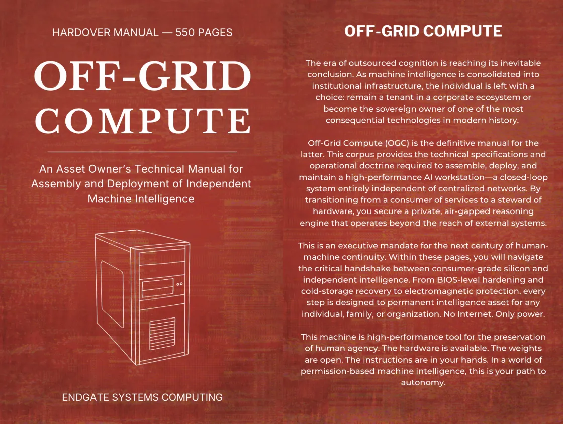 The Off-Grid Compute manual shows you to build an off-grid, independent artificial intelligence system. This teaches you how to deploy a generational asset for information leverage. You control the memory, the storage, and the power. All on a familiar interface.